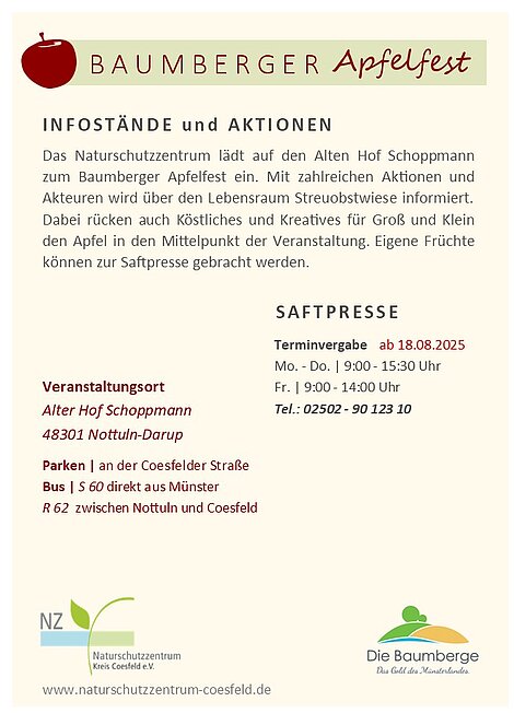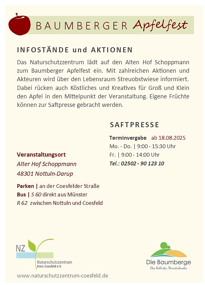 Das Naturschutzzentrum lädt auf den Alten Hof Schoppmann zum 13. Baumberger Apfelfest ein. Mit zahlreichen Aktionen und Akteuren wird über den Lebensraum Streuobstwiese informiert. Dabei rücken auch Köstliches und Kreatives für Groß und Klein den Apfel in den Mittelpunkt der Veranstaltung. Eigene Früchte können zur Saftpresse gebracht werden.