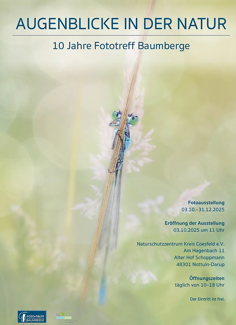 Anlässlich des 10-jährigen Bestehens präsentiert das Naturschutzzentrum Kreis Coesfeld gemeinsam mit dem Fototreff Baumberge die Ausstellung „Augenblicke in der Natur“.