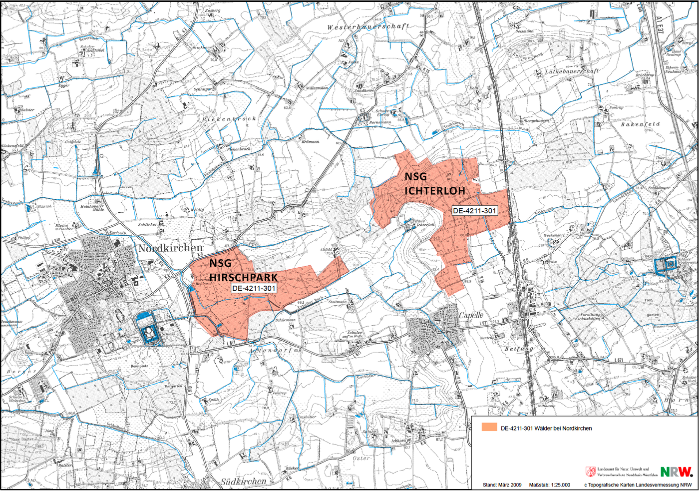 Das FFH-Gebiet "Wälder Nordkirchen" ist 326 ha groß und setzt sich zusammen aus dem NSG Hirschpark und dem NSG Ichterloh.